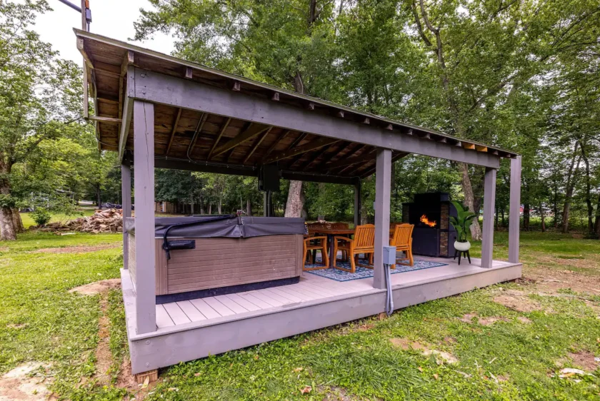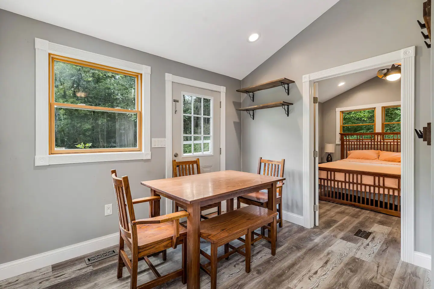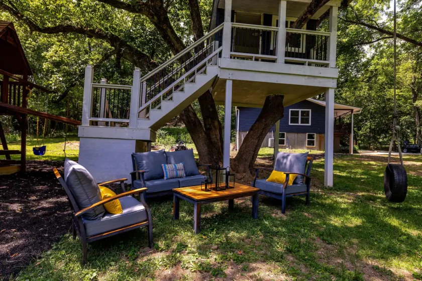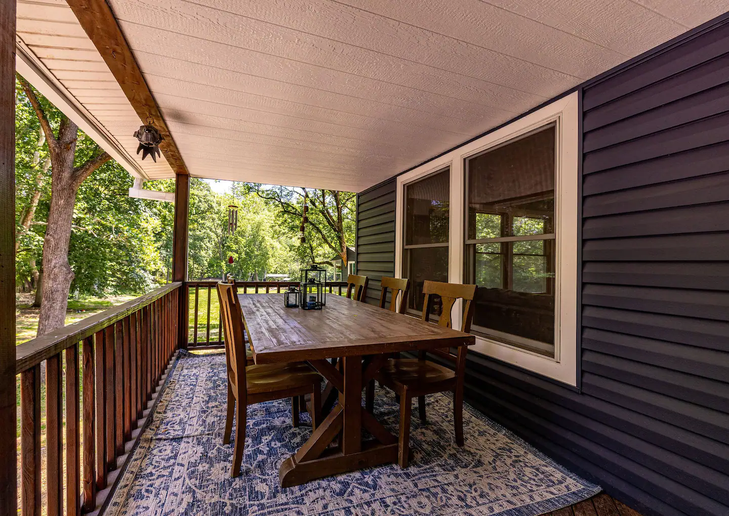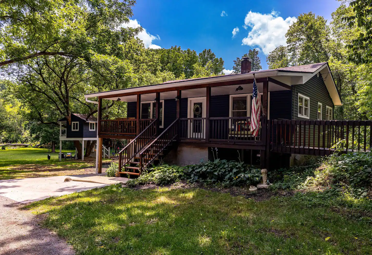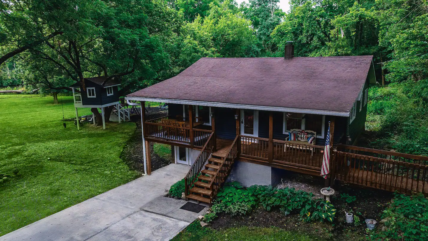 Our charming 2-bedroom, 2-bathroom home features everything you need for a comfortable stay. For a unique experience, the treehouse can serve as a third bedroom, complete with a full-sized bed and electricity. Relax on the riverside pavilion, soak in the hot tub, or gather around the fire pit under the stars. Canoes and kayaks are available at no cost, and a sandy riverside beach makes the perfect spot to unwind or launch your water adventures.